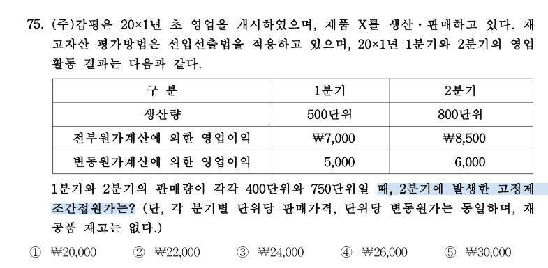 - 고정원가 불변 가정의 오류: 1분기와 2분기의 총 고정제조간접원가가 동일할 것이라고 가정하고 풀면 안 됩니다. 문제에서 단위당 판매가격과 변동원가만 동일하다고 했지, 고정원가가 동일하다는 조건은 없습니다.